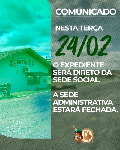 Comunicado: Expediente de 24 de Fevereiro de 2026 24/02/2026 Notícias Informamos que o expediente do dia 24/02/2026 será realizado diretamente de nossa Sede Social. Em razão disso, a Sede Administrativa no Parque Conta Dinheiro, estará fechada nesta data. Contamos com a compreensão de todos. Navegação de Post Anterior Post anterior: Encontro das Danças Tradicionais reuniu mais de 200 tradicionalistas em ChapecóPróximo Próximo post: Encontro da Diretoria Executiva e Coordenadores Artísticos e Campeiros