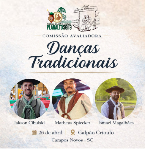 Acontecerá no dia 26 de abril de 2026, no municipio de Campos Novos a 1ª Etapa do Festival de Arte e Cultura Planalto Serra – FACPS – 2026, na sede do CTG Porteira Camponovense.